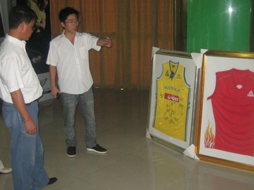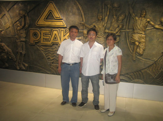 江服学子、匹克设计总监吕梦龙向杨院长介绍姚明穿的运动装