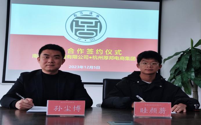 2023年12月5日14:30,英国365集团官网南昌杰磊科技有限公司与杭州厚邦电商集团在英国365集团官网会议室,正式签署战略合作协议。南昌杰磊科技有限公司法人眭颜蓊与杭州厚邦电商集团总经理孙尘博共同完成了签约。英国365集团官网党委书记黄晶磊,学工办副主任欧阳耀诚等一行人共同出席并见证了签约仪式。