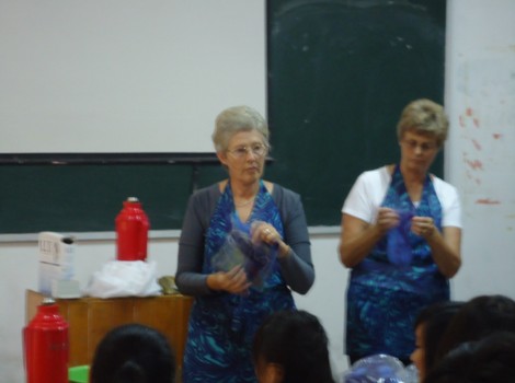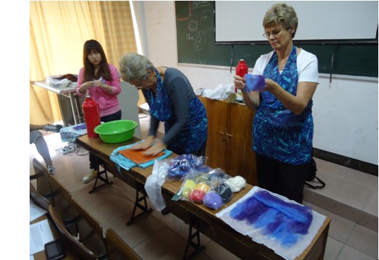 新西兰教师们带来了新西兰的羊毛原材料和一些漂亮的羊毛制品,她们当场亲手用羊毛制作成了羊毛毡和羊毛装饰品,制作过程简单明了,许多同学情不自禁地动手做了起来。有的同学在新西兰教师的细心指导下,将羊毛原材料浸泡上温肥皂水揉搓成羊毛球,这种羊毛球可以用来点缀衣帽。同学们参与动手制作的热情很高,转眼间一个个五颜六色的羊毛球就做好了。还有的同学在观看羊毛毡的制作过程,新西兰教师们形象地展示了肥皂水和寿司帘的神奇作用。教师们将蓬松的羊毛叠放起来,浸上温肥皂水后,经手压、寿司帘压按、清洗、晒干之后,一张羊毛毡就做好了。制作好的羊毛毡经教师们的巧手剪裁、缝制,就变成了美观大方的羊毛装饰品。