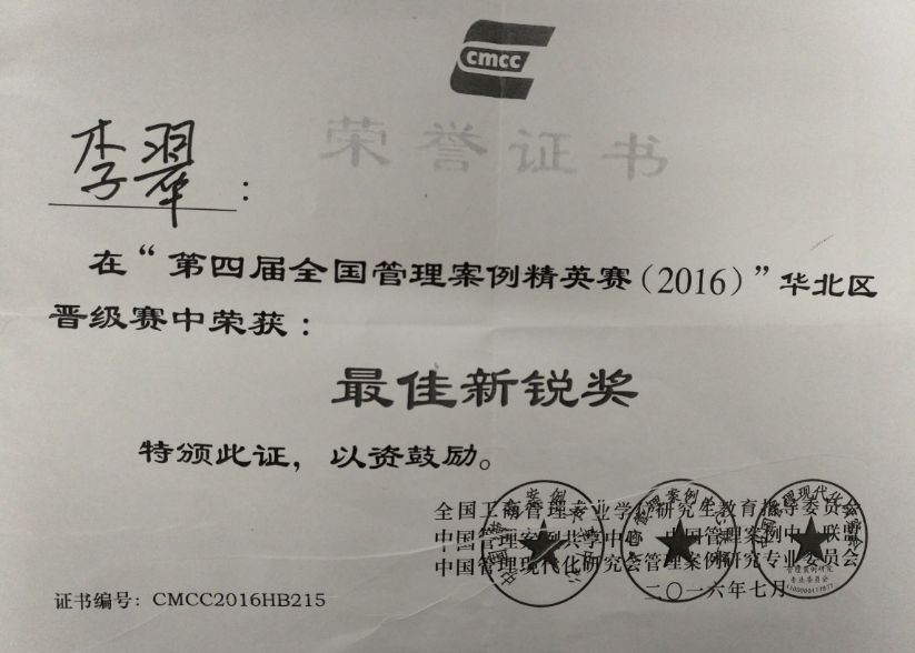 2016年7月16日-17日,“第四届全国管理案例精英赛华北区晋级赛”隆重举办。本届晋级赛参赛队伍由北京科技大学、中国政法大学、中国社会科学院研究生院、中央财经大学、北京航空航天大学等14所院校、23支队伍组成。比赛围绕“土巴兔”公司商业模式和“一点味”公司所遇瓶颈进行案例分析,并接受现场评委及观众提问。在连续两天如火如荼的比赛中,我院教师李翠代表北科二队参赛,通过深入分析“土巴兔”企业资源和能力、盈利方式和客户价值等商业模式,她们的队伍提出基于互联网思维的家装产品和服务的出现,用户体验和接受度有所提升,“土巴兔”应该整合产业链,促使互联网家装修市场商业模式的创新与未来标准化的发展实施,从而进一步实现商业模式中的盈利模式。将现场评委及观众带入思考,赢得评委的高度赞赏。我院市场营销教研室李翠老师在本届比赛中荣获“最佳新锐奖”。