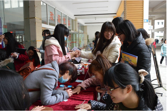 服装商贸分院讯(秘书部:陈航 胡炜琴 彭赣萍):三月的校园,洋溢着青春和活力,充满着自信和美丽,回荡着书声和笑语。为响应校团委的号召,丰富校园文化建设,庆祝第九届江服女生节的到来,3月10日中午,商贸分院团总支、学生会在第五食堂门口举行了主题为“只要你驻足,就送你美丽”的义务美甲修眉盘发活动。
