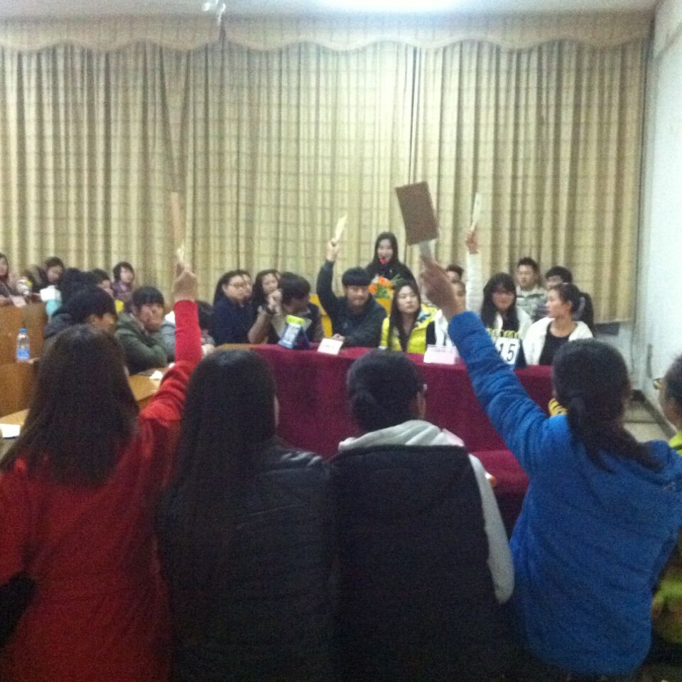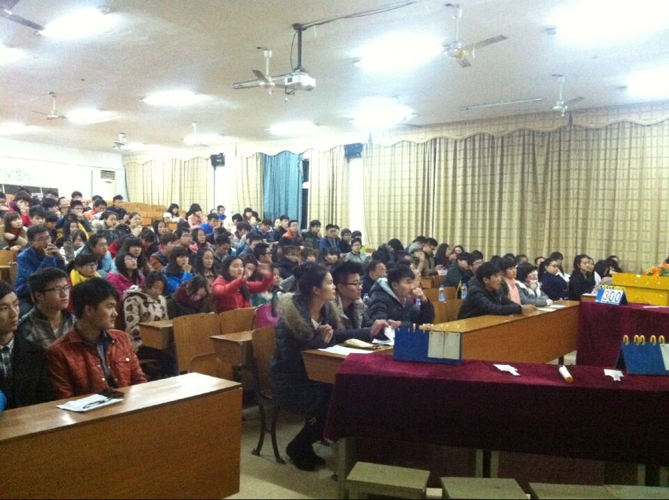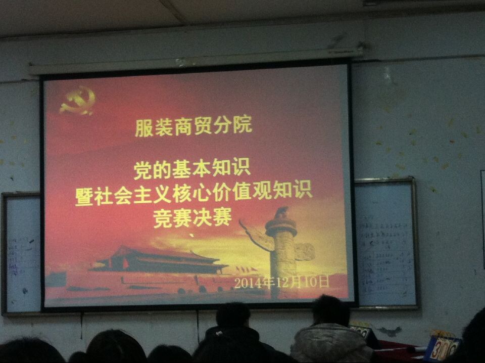 商贸分院讯:(秘书部:陈航、胡炜琴、彭赣萍):为响应党的十八届四中全会精神,全部落实《关于在新生中开展党的基本知识教育的实施意见》(江服党字【2014】8号)文件精神,进一步激发大学新生进行党的历史、理论和实践等方面的基本知识和社会主义核心价值观的学习热情,提高对党的认识,增进对党的感情。我院党总支于12月10日晚在艺术楼西中多媒体125教室隆重举行了“党的基本知识暨社会主义核心价值观知识竞赛决赛”。莅临本次大赛的领导有校党委副书记温诒忠、我院党总支书记陈翠娥、分院第一党支部委员李翠、第二党支部委员宋丽娟。分院全体学生党员、入党积极分子以及14级各班学生代表共200余人观看此次决赛。