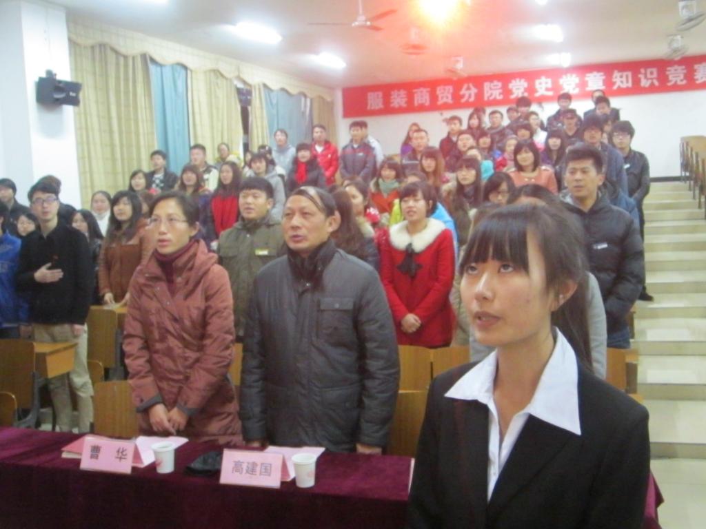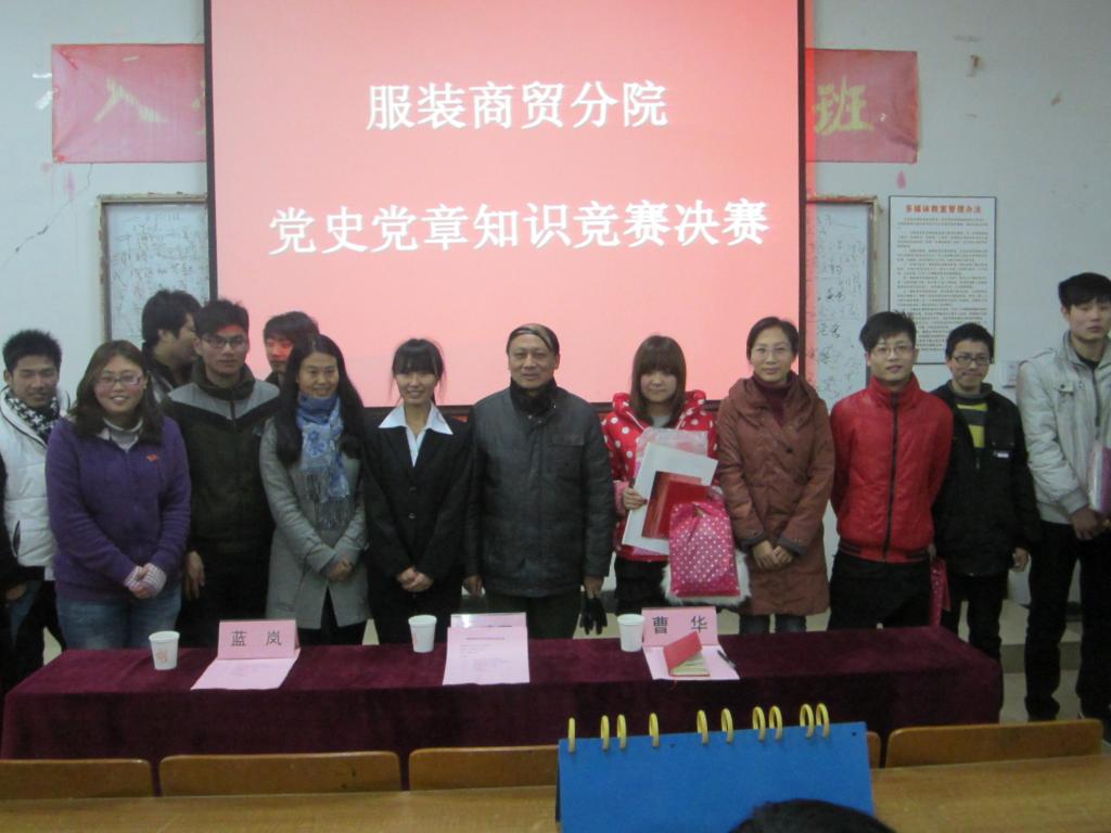 服装商贸分院讯(记者:郑依文):为进一步学习宣传贯彻十八大精神,学习了解领会党史党章,服装商贸分院党建联合分会于2012年12月18日晚上19时在艺术楼南一多媒体举办了“党史党章知识竞赛决赛”。参加此次比赛的领导有校党委副书记高建国、商贸分院党总支副书记曹华、商贸分院学工办主任兼团总支书记蓝岚以及商贸分院所有党建成员。