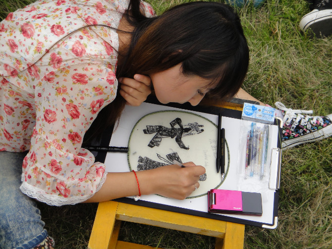 紧张激烈的比赛时间仅仅进行过半,伞组、扇组各位选手的绘画作品已经初见雏形,微风吹过河面,拂过柳叶,天气的凉爽让在场席地作画的选手们更加聚精会神的将全部精力投入自己的作品中去。更让我们荣幸的是,副校长李国祥即兴为我院第五届伞绘、扇绘题词。