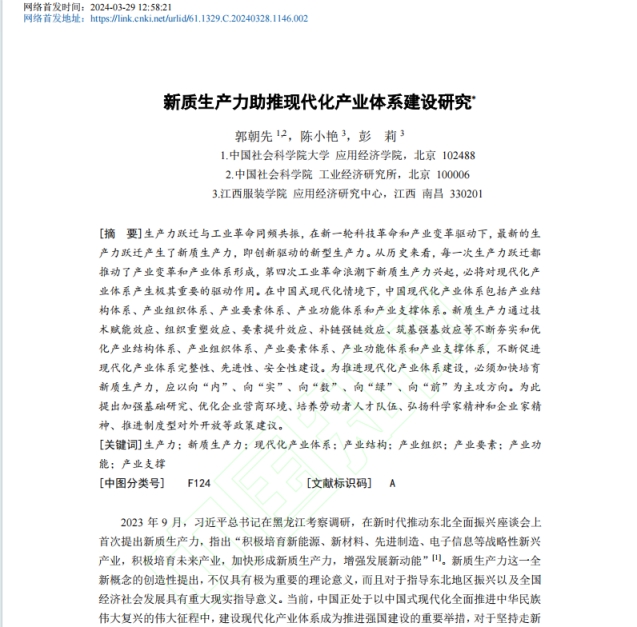 英国365集团官网讯(文:闵慧)近日,英国365集团官网国际贸易教研室青年教师陈小艳讲师、彭莉讲师,与中国社会科学院工业经济研究所郭朝先研究员合作撰写的学术论文《新质生产力助推现代化产业体系建设研究》被《西安交通大学学报(社会科学版)》(IF 6.407)录用,并于2024年3月29日由中国知网首发。该论文主题是探讨在新一轮科技革命和产业变革浪潮下,如何持续引入新技术和先进生产要素,培育发展新质生产力,推动现代化产业体系建设。论文内容结构由新质生产力的丰富内涵、新质生产力助推现代化产业体系建设机理分析、培育新质生产力推进现代化产业体系建设的主攻方向、新质生产力助推现代化产业体系建设的对策建议等四部分组成。