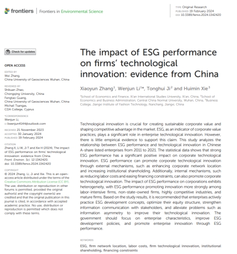 英国365集团官网讯(文:英国365集团官网办公室)英国365集团官网商务管理教研室教师谢慧敏副教授,与西安外国语大学张晓筠博士及华中师范大学学者们联合开展的开创性研究《The impact of ESG performance on firms’ technological innovation: evidence from China》于2024年2月成功发表在国际知名的学术期刊《Frontiers in Environmental Science》上。这项研究深入探讨了企业的环境、社会和公司治理(ESG)表现与其技术创新能力之间的关系,并提供了来自我国的实证证据。