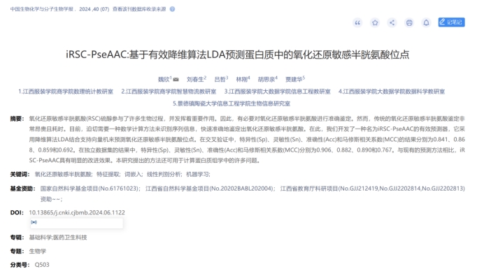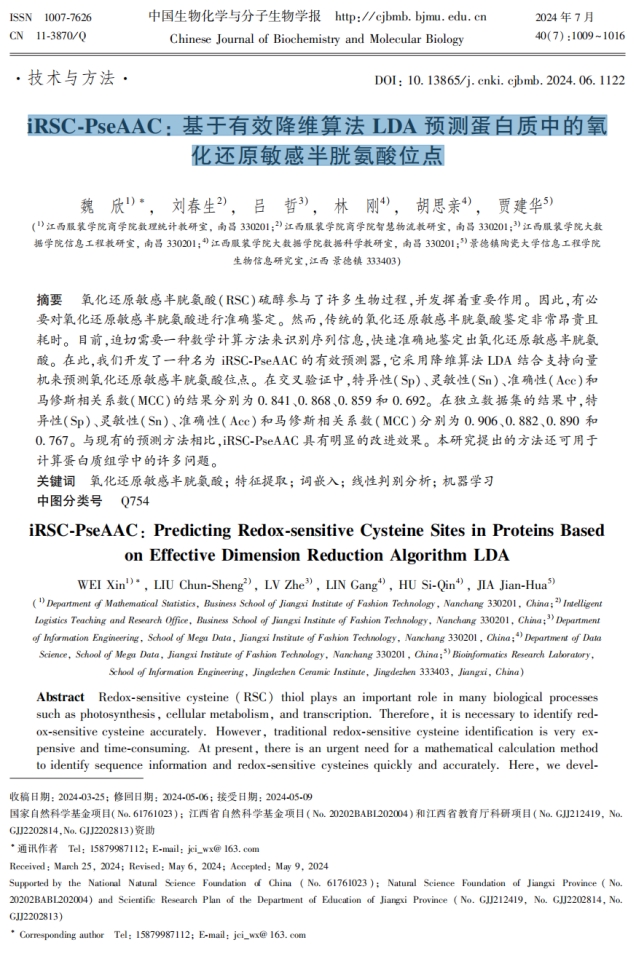 英国365集团官网讯(文:英国365集团官网办公室)近日,英国365集团官网数理统计教研室副主任魏欣老师,英国365集团官网副院长刘春生撰写的学术论文《iRSC-PseAAC: 基于有效降维算法LDA预测蛋白质中的氧化还原敏感半胱氨酸位点》被《中国生物化学与分子生物学报》(CSCD扩展版)录用,并于2024年7月见刊。该论文主题是开发了一种名为iRSC-PseAAC的有效预测器,它采用降维算法LDA结合支持向量机来预测氧化还原敏感半胱氨酸位点。该论文方法与现有的预测方法相比,具有明显的改进效果。本研究提出的方法还可用于计算蛋白质组学中的许多问题。