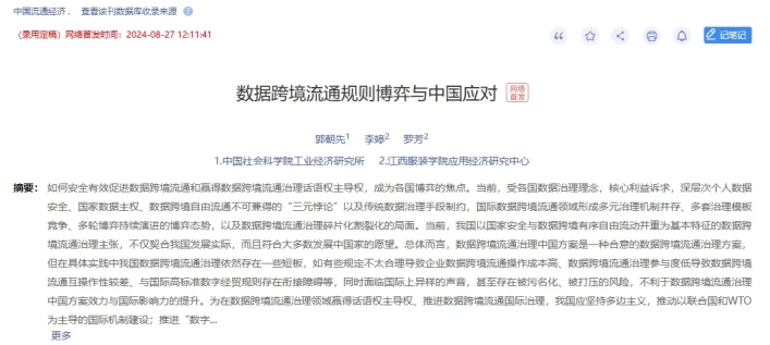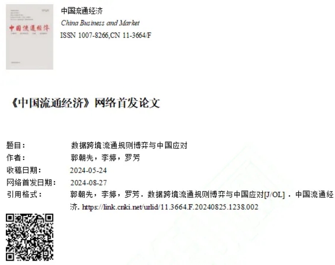 英国365集团官网讯(文:英国365集团官网办公室)近日,中国社会科学院工业经济研究所产业组织研究室主任郭朝先与英国365集团官网罗芳副院长及国际贸易教研室青年教师李婷讲师合作撰写的学术论文《数据跨境流通规则博弈与中国应对》被《中国流通经济》(C扩IF 7.2)录用,并于2024年8月27日由中国知网首发。该论文主要探讨了当前受各国数据治理理念,核心利益诉求,深层次个人数据安全、国家数据主权、数据跨境自由流通不可兼得的“三元悖论 ”以及传统数据治理手段制约,国际数据跨境流通领域形成多元治理机制并存、多套治理模板竞争、多轮博弈持续演进的博弈态势,以及数据跨境流通治理碎片化割裂化的局面。在该局面下我国以国家安全与数据跨境有序自由流动并重为基本特征的数据跨境流通治理主张,不仅契合我国发展实际,而且符合大多数发展中国家的愿望,但也面临企业数据跨境流通操作成本高、数据跨境流通治理参与度低导致数据跨境流通互操作性较差、与国际高标准数字经贸规则存在衔接障碍等,以及面临国际上异样的声音,甚至存在被污名化、被打压的风险,不利于数据跨境流通治理中国方案效力与国际影响力的提升。