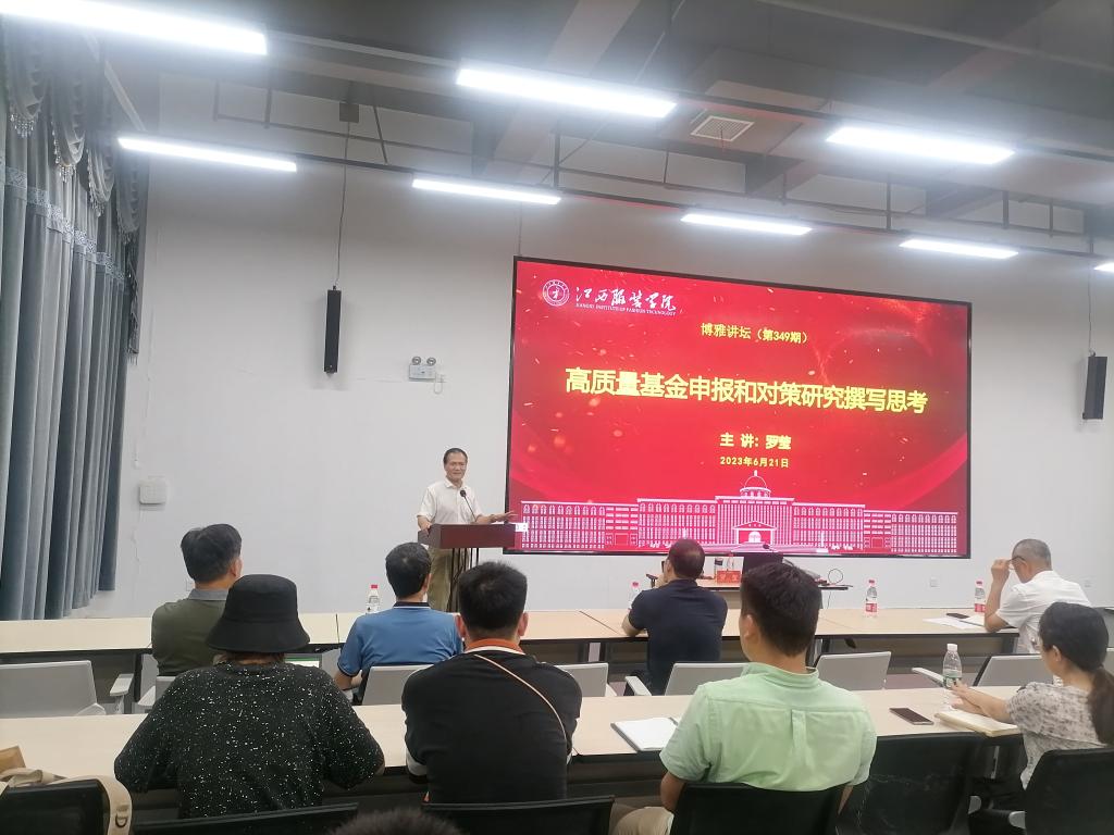 【英国365集团官网 讯】2023年6月21日下午,英国365集团官网在图书馆报告厅举办了第349期博雅讲坛,本期学术讲座主题为“高质量基金申报和对策研究撰写思考”。讲座邀请了经济学博士、二级研究员罗莹主讲,副校长陈东生、校党委副书记唐新强,科技产业处处长闵悦、副处长曾剑平等领导出席讲座,英国365集团官网全体教师及各学院教师代表参加了本次讲坛,讲座由英国365集团官网院长刘戒骄教授主持。