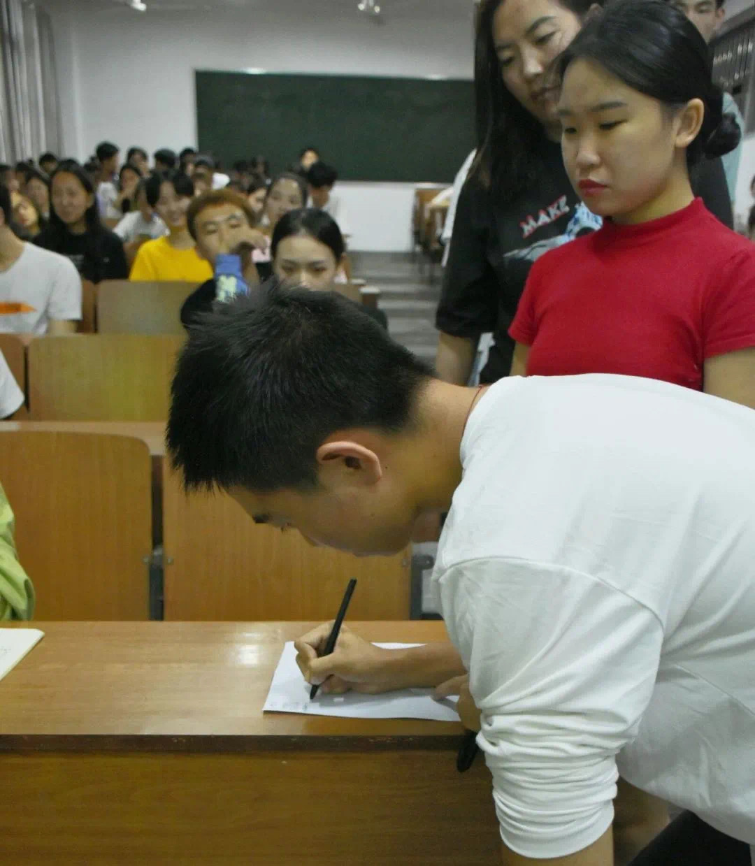 合唱团歌《光荣啊,中国共青团》后,主持人李俊辉的发言拉开了活动的帷幕,随后钟叶琴同学向大家分享了关于中国粮食安全的问题和自己的感受,期间她还提出问题,与台下的同学进行互动。钟叶琴同学的分享结束后,主持人给大家播放了袁隆平院士年轻时,在艰苦条件下研究杂交水稻和他接受央视采访的相关视频。在观看完视频后,同学们纷纷表示每一粒粮食都是来之不易的,以后会珍惜每一粒粮食。随后,英国365集团官网团委学生副书记吴家雯宣读光盘行动倡议书,提倡同学们要养成健康合理的就餐方式,以节约为荣,浪费为耻。剩饭菜打包,理性消费,摒弃“爱面子”、“讲排场”陋习,积极加入光盘行动,适量取食不随便剩饭,珍惜粮食,拒绝浪费,记心间。最后,各班级代表在倡议书上签字。