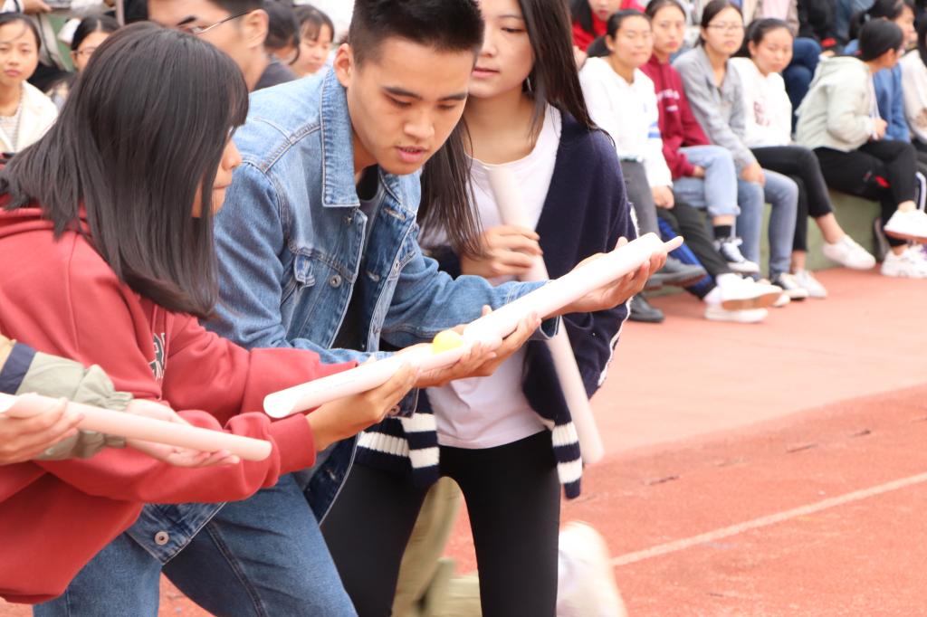在两圈的热身晨跑过后,本次素质拓展活动正式开始。活动主要内容是进行“珠行千里”游戏,参赛成员们精神抖擞、志气高昂。比赛正式开始前,各班级抓紧每分每秒进行练习,找准游戏诀窍。活动进行时,参赛班级表现各异。首先上场比赛的两个班级游戏能力不相上下,场上竞争非常激烈,场下的同学也激动不已,情绪高涨,加油声、呐喊声非常响亮,非常给力。果真是活动一开始就让我们眼前一亮,惊喜万分。在后续的比赛中,许多班级成员之间也配合得默契十足,活动节奏又准又快,迅速地到达终点,在短时间内将游戏顺利完成。