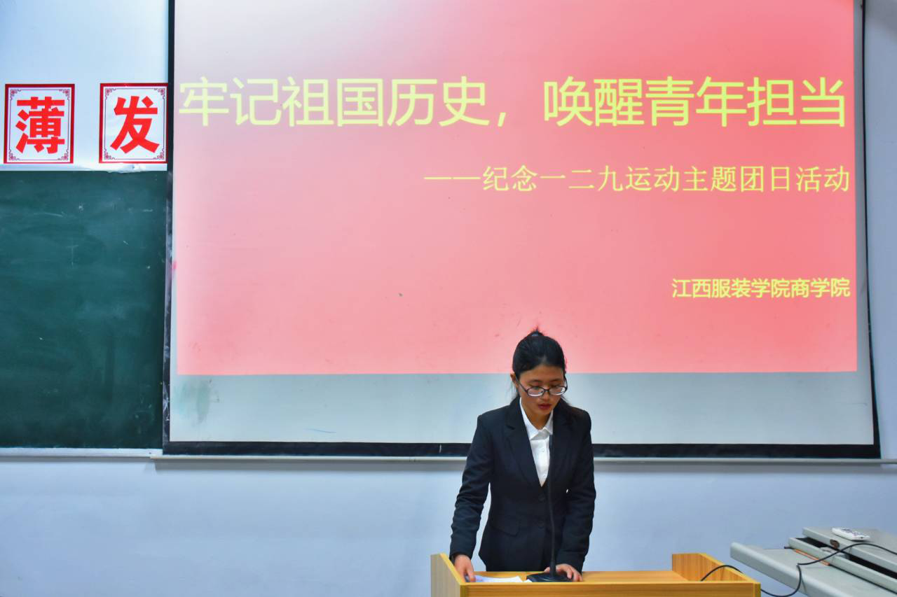 为了纪念一二九爱国运动,激发青年大学生的爱国主义意识以及奋发图强的精神,使青年大学生勿忘历史,牢记使命。我院于12月9日晚6点30分在主教楼129教室举办了主题为“牢记祖国历史,唤醒青年担当”的团日活动。本次活动由学术引导部干事孙吟主持,英国365集团官网辅导员袁雪梅、学生团委副书记饶克文出席。各班学生代表参加此次活动。