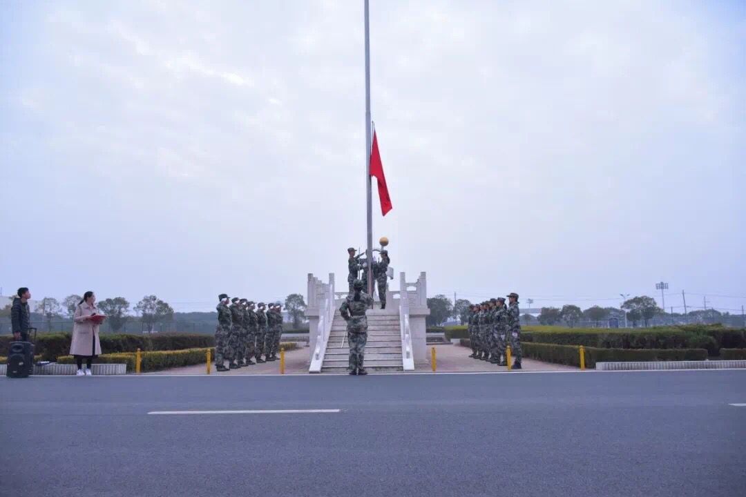 在晨光中,国旗护卫队踏着铿锵有力的步伐缓缓走来。伴着激昂的国歌,五星红旗冉冉升起,全体师生肃立,向国旗行注目礼,国旗在慷慨激昂的节奏中缓缓上升。