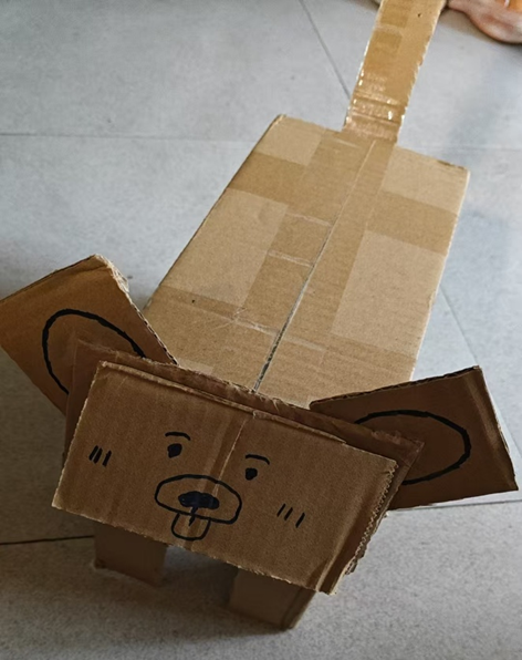 卡通熊的形态简洁而充满灵性:圆润的头部与半圆形耳朵以几何线条勾勒,黑色笔触勾勒的小圆眼睛、椭圆形鼻子与微笑的弧线,寥寥几笔便捕捉到孩童般的天真神情。最引人注目的是从身体延伸出的长条形纸板结构——它可以是挥舞的手臂,也可以是随风摇曳的装饰,这种开放式的设计赋予观者想象的空间,让静止的雕塑拥有了动态的诗意。