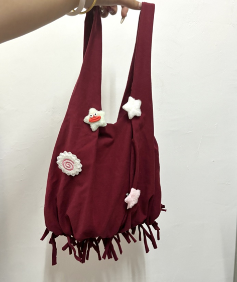 这是一个用旧衣服改造的手提包,在去上课需要装书的时候就可以使用。其实这个的制作方法非常简单,甚至不需要用到针线。我们只需要将旧衣服平铺开来,然后根据自己的喜好裁剪出合适的形状和大小。接下来,将裁剪好的布料系在一起,形成一个手提包的雏形,就可以轻松提拎了。为了让手提包更加美观,我们还可以在包的表面添加一些装饰,比如贴上一些可爱的图案或者贴上一些布料的花朵等。这样一个既环保又实用的手提包就完成了,不仅让旧衣服得到了充分的利用,还能让你在外出的时候成为一道亮丽的风景线。