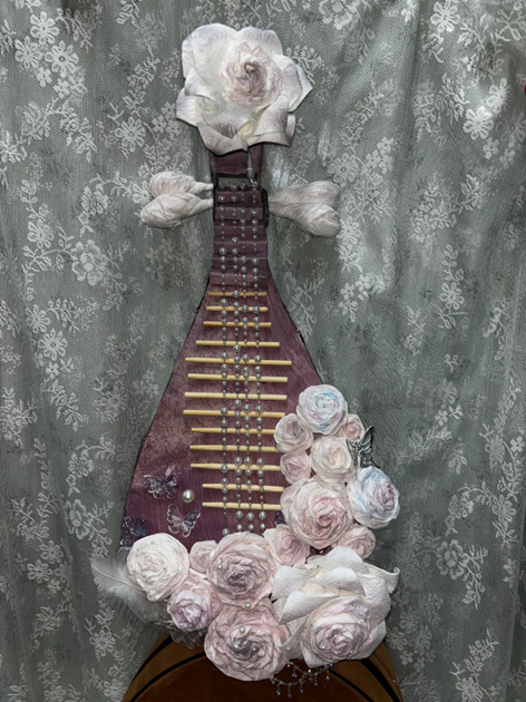 最引人注目的是,琵琶周身装点着大量由餐巾纸制作的花朵,这些餐巾纸经染色、折叠、卷曲等工序,蜕变为栩栩如生的玫瑰。从浅粉到淡紫的色彩过渡自然,层次丰富,宛如真实花朵绽放。花朵分布巧妙,琴头、琴身皆有点缀,既增添视觉美感,又赋予琵琶浪漫气息。琴颈处,排列整齐的“琴品”由一次性筷子制成,还原琵琶的基本构造。琴弦串有珍珠,在光线下闪烁微光,既具装饰性,又巧妙模拟出琴弦与琴品的交互。此外,还有蝴蝶装饰、羽毛等细节元素,进一步丰富作品层次,营造出灵动氛围。