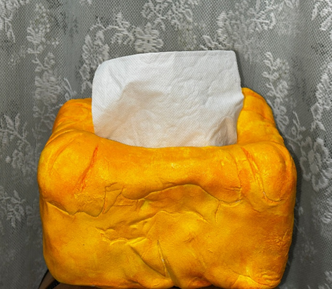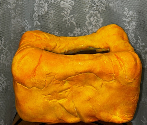 在数字文明冲击实体经济的时代,快递纸箱作为消费社会的物质印记,承载着现代生活特有的时空压缩感。本作品以解构主义视角重构废弃包装,通过“物质转化”的创作哲学,将工业文明的标准化产物转化为承载人文温度的手工器物。灵感源自汉代画像砖的叙事美学,以“食”为媒,构建古今生活美学的对话场域。以石塑黏土模拟面团质感,采用“捏塑-压模-雕刻”三阶技法。作品以面包为造型母题,实为对“民以食为天”文化基因的视觉转译。