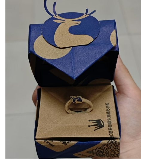 这枚戒指盒诞生于一次对旧物与创意的碰撞实验。选用废弃的瑞幸咖啡蓝色包装盒为主材,通过剪裁、粘贴、手绘等手工技法,将其蜕变为兼具实用性与艺术感的戒指收纳盒。整体设计以“鹿”为灵感,运用浅棕色纸张剪出鹿的剪影轮廓,优雅的形态与深邃的蓝底形成鲜明对比,仿佛森林中灵动的使者,为平凡的盒子注入诗意。