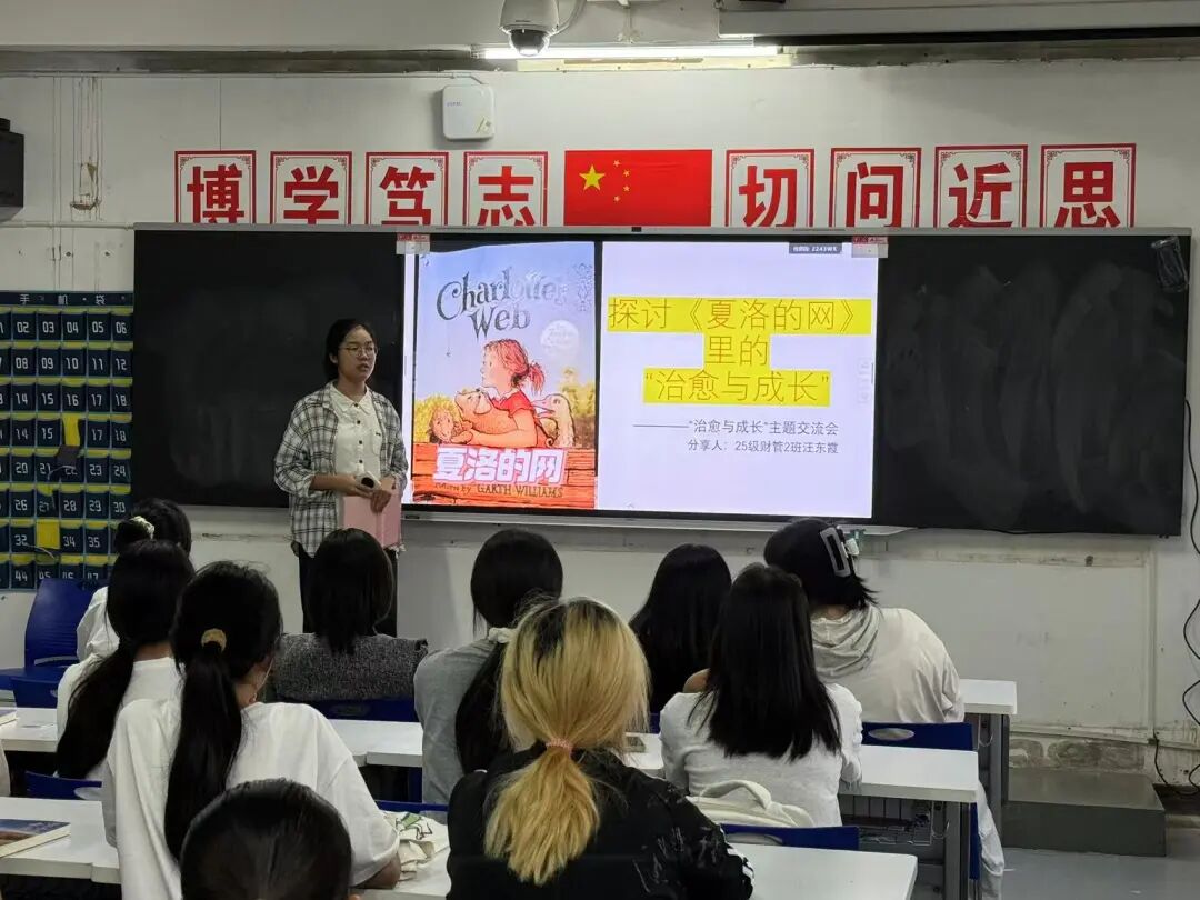 为了进一步活跃气氛,加深大家对“治愈与成长”主题的理解,读书会特别设置了“治愈关键词接龙”小游戏。随后,读书会继续进行班级分享环节。25财管本科1班的刘嫣然同学再次分享了《小王子》的感悟,而25财管本科2班的汪东霞同学则带来了《夏洛的网》的阅读心得,刘艺含同学也分享了自己对《小王子》的独特理解。每一段讲述都饱含深情,触动着在场每一个人的心弦。