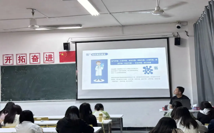 在介绍常见传染病及预防部分,主讲人详细讲解了流感、手足口病、水痘等常见传染病的预防方法。他特别提醒学生们要关注自己的身体状况,一旦出现疑似症状,要及时就医并告知医生自己的病史和接触史,以便医生更好地制定治疗方案。