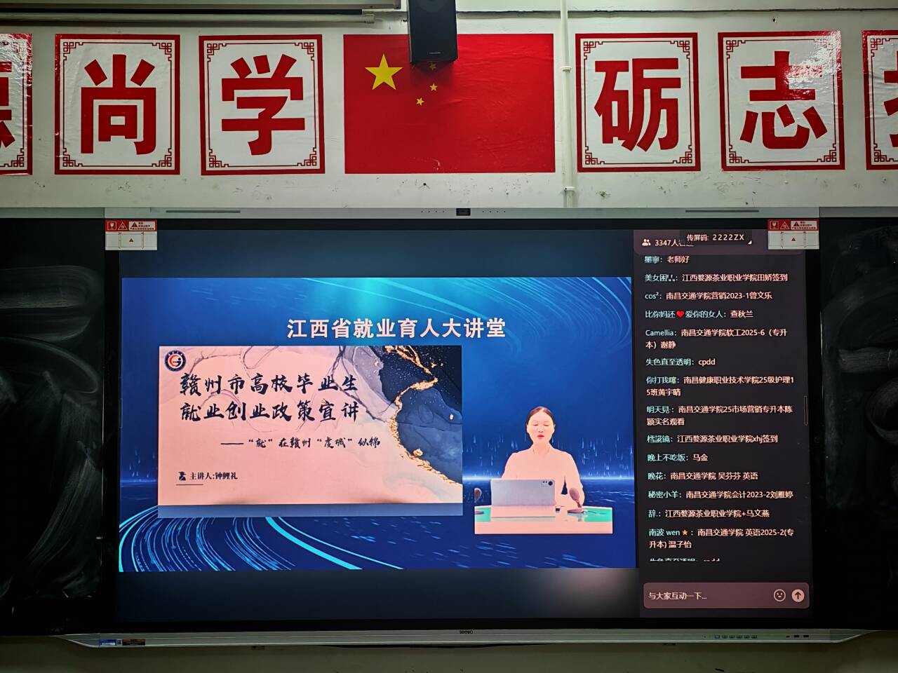 本次直播课程特邀资深就业政策专家、赣州市章贡区就业服务中心副主任钟鲤礼担任主讲,围绕“高校毕业生就业创业政策解读+赣州优质企业直播带岗”展开现场授课。钟鲤礼老师结合当前高校毕业生就业环境,系统解读了国家及江西省出台的各类就业扶持政策,从补贴申领条件到求职权益保障,从基层就业支持到创业扶持路径,内容翔实、贴近实际,值得一提的是,本次直播创新融入“直播带岗”环节,多家赣州优质企业现场发布岗位需求,为同学们提供了“足不出校”即可对接心仪企业的宝贵机会。