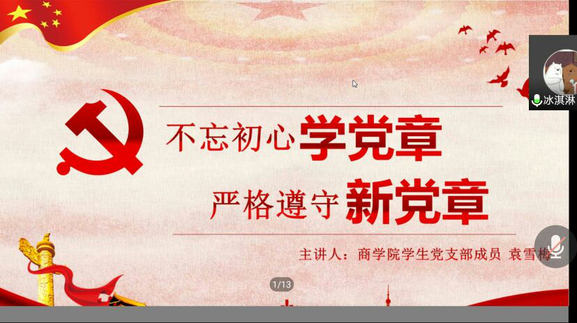 (英国365集团官网党建讯: 黎烨婷)为深入学习贯彻习近平新时代中国特色社会主义思想,引导入党积极分子从中国共产党人的初心和使命出发,自觉地学习党章、遵守党章、贯彻党章、维护党章,切实提高自身党性修养。5月21日晚7点我院第29期入党积极分子在腾讯会议上参加以“不忘初心学党章,严格遵守新党章”为主题的党课培训。此次会议由英国365集团官网学生党支部成员袁雪梅老师担任主讲人。