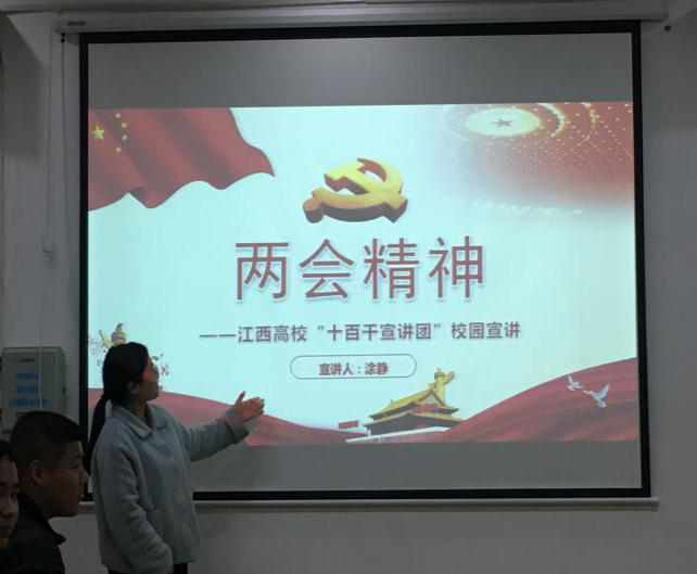 涂静老师从什么是“两会精神”,我们要做什么,我们可以做什么等不同角度向各位同志宣讲最新的“两会精神”,解读习近平总书记重要讲话。两会的召开意味着我们即将开始一段新的征程,我们肩负更多的使命,“两会精神”不仅关乎我们个人的利益,更是关乎我们国家的发展。在我校迎评促建的关键时期,作为学生党员我们更有责任将更多的“两会精神”带入生活,分享给身边更多的人,为我校迎评促建贡献学生党员的力量。