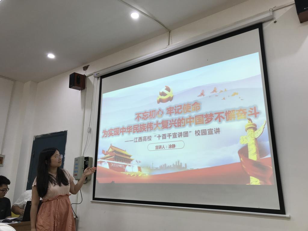 为保持和增强学生党员的政治性、先进性、群众性,牢固“四个意识”、增强“四个自信”,英国365集团官网辅导员涂静老师做十九大精神“十百千宣讲”,通过十九大精神的学习、领会,进一步团结带领英国365集团官网广大学生党员听党话、跟党走、感党恩,把力量凝聚到实现党的十九大任务中来。活动中,涂静老师选取十九大部分内容作了学习和解读,从十九大主题中初心的定义谈到开展十九大精神学习的意义,从我党不忘初心一路走来的历程谈到中华民族伟大复兴的宏伟目标,最后,通过十九大目标延伸出怎样“不忘初心 继续前行”引出新时代、新征程、新目标,参加学习的人员都听的聚精会神,分外认真。