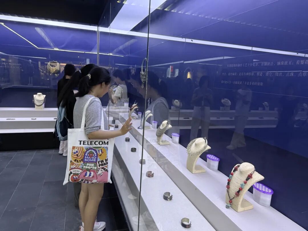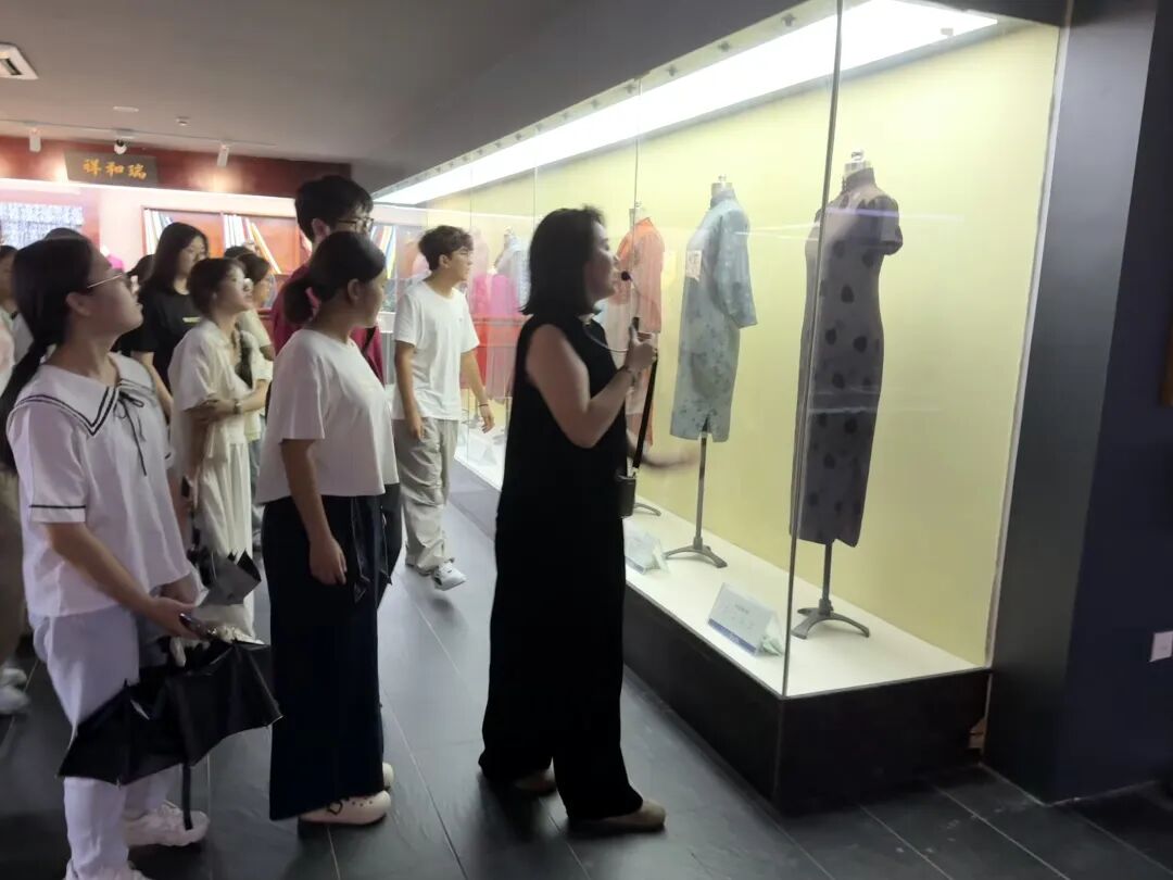 在讲解员的细致引领下,同学们逐一游览了博物馆内的古代服饰、各式民族服饰、赣鄱地区少数民族的特色服饰、珍贵民族服饰藏品等众多展区,开启了一场追溯华夏千年服饰文化的历史之旅。踏入服饰博物馆的瞬间,同学们便对每一件展品产生了浓厚的兴趣。从质地上乘的衣料到精致的成衣,从璀璨夺目的饰品到各式鞋帽,从制作工具到染色原料,涵盖了从少数民族的鱼皮服饰、火草衣物到赣地畲族的“凤凰装”,再到当代设计大师的传世之作以及江服学子的荣誉作品,这些总计两万一千三百余件的珍贵藏品,使同学们对华夏民族千百年来丰富的服饰历史与精湛的服饰工艺有了更加深刻的认识。