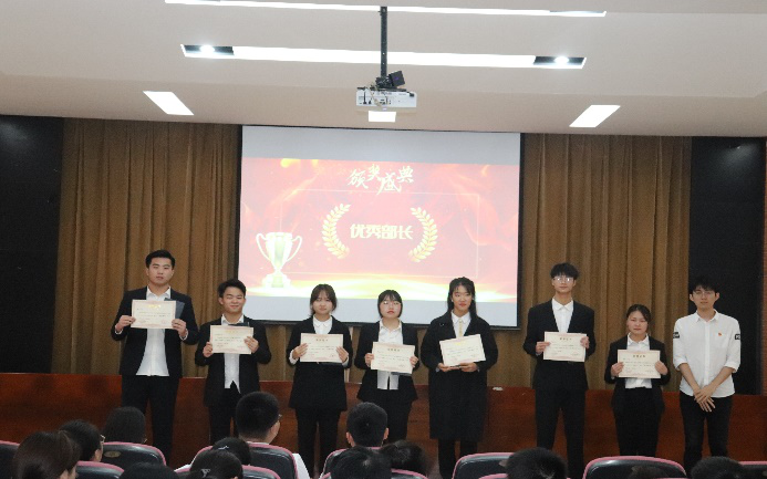 表彰决定宣读结束后,学生会副书记韩忆为高亮琴、刘招池、倪秀琳等30位同学颁发优秀部员奖。蔡子威老师为黄敏、廖九香、张圆圆等七位同学颁发优秀部长奖。团委书记匡瑞青为文工部、文体部、志工部、宣传部颁发优秀部门奖。颁奖仪式结束后,各部部长为部员颁发聘书。