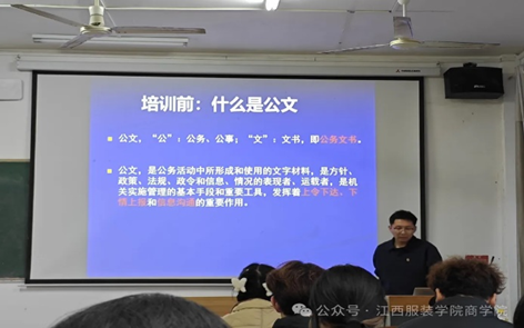 培训以“什么是公文”开启。王幸俊解释道,公文是公务活动中所形成和使用的文字材料,是方针、政策、法规、政令和信息、情况的表现者、运载者,是机关实施管理的基本手段和重要工具。王幸俊老师讲述道公文写作的基本要求是主题明确、内容真实、结构清晰、写作规范、语言精练。