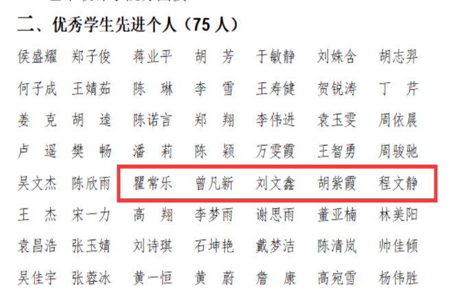 瞿常乐、曾凡 刘文鑫、胡紫霞、程文静五位同学荣获“优秀学生先进个人”