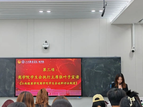 会议第三项,学生会执行主席张叶子宣读《英国365集团官网学生会述职评议制度》,从述职内容、评分标准到评议流程进行系统性解读,强调述职评议是检验工作成效、促进自我革新的重要机制,要求以严肃态度确保大会公平公正。
