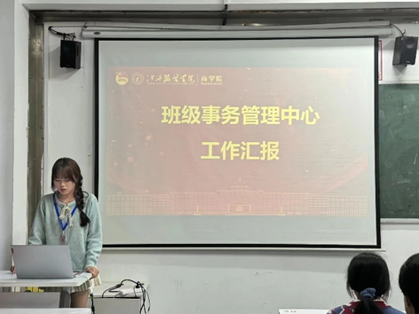 随后,各部门负责人轮流上台,就本部门的工作进行了详细的汇报。班级事务管理中心汇报了近日早晚自习检查以及卫生检查情况;班级文化建设中心则分享了近一个月以来撰写新闻稿的成果;班级活动策划中心介绍了组织活动方面的成果与计划;职业能力发展中心重点介绍了有关近期活动的签到工作。
