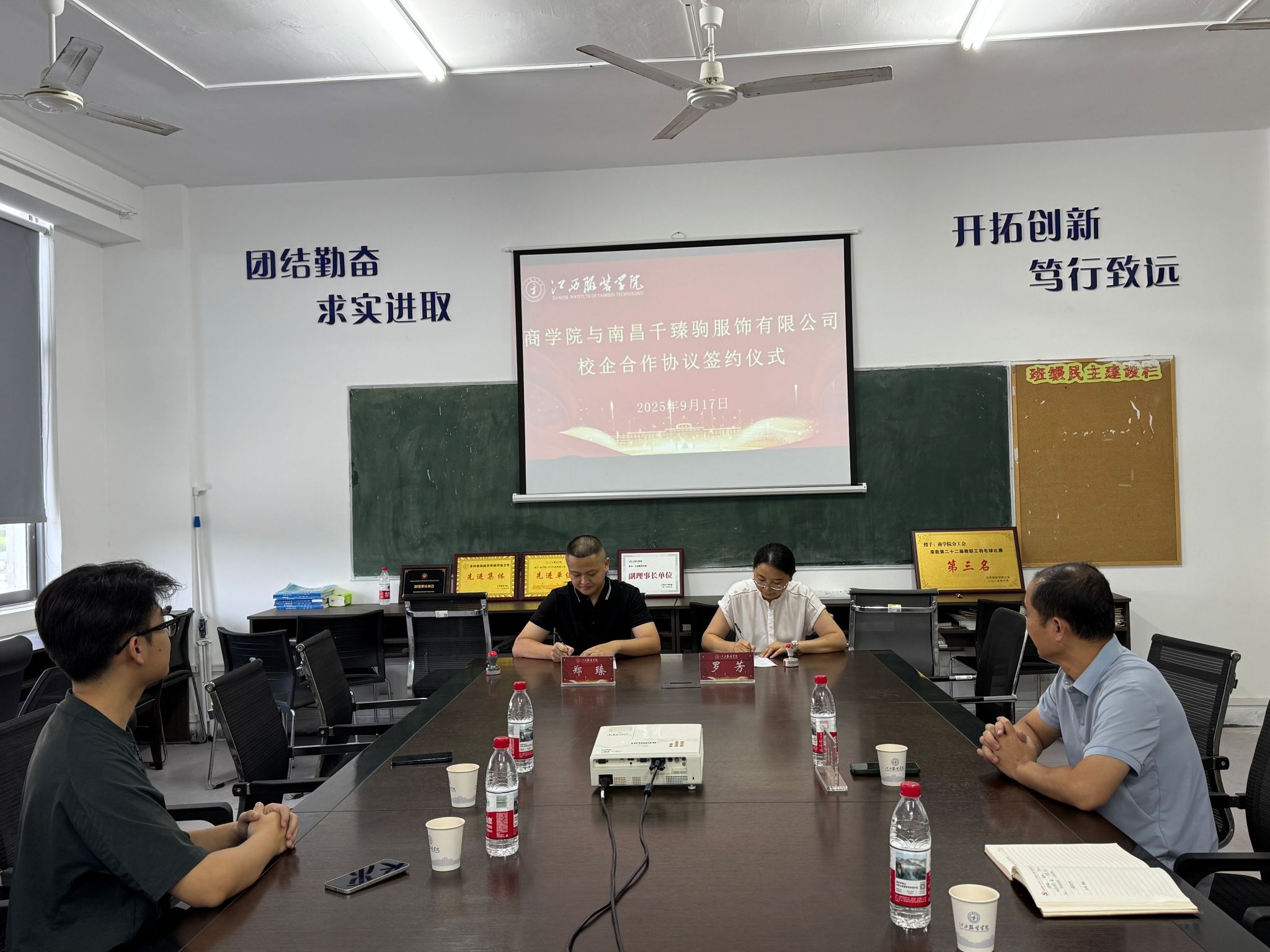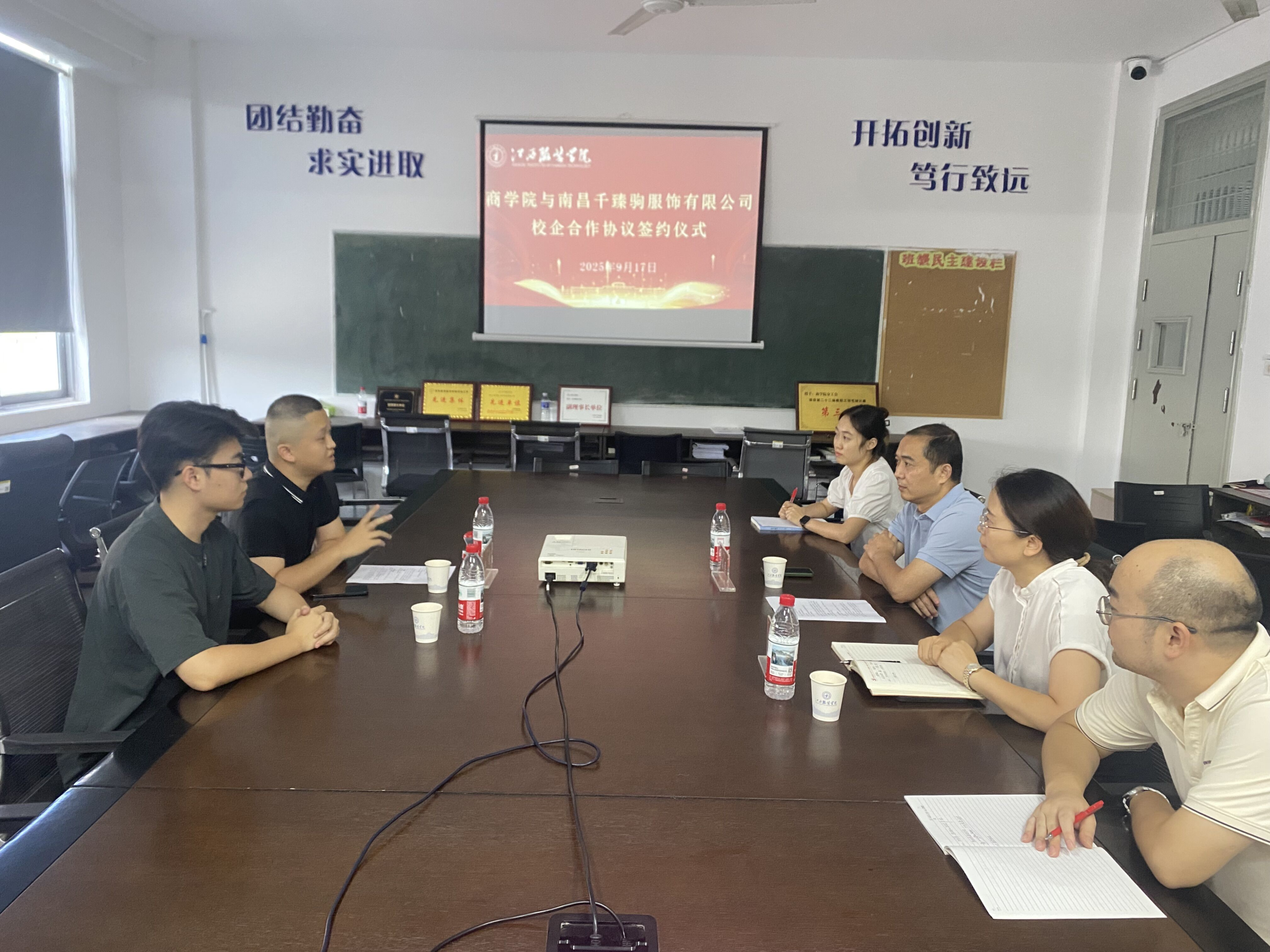 为进一步做好毕业生就业服务工作,持续深入推进校企合作工作,培养符合行业需求和社会发展需要的高素质应用人才,9月17日,南昌千臻驹服饰有限公司经理郑臻等人来校展开了校企深度合作的签约仪式,并就相关专业在产教融合、专业实习、双师型师资培养、科学研究、人才培养、学生就业等领域合作事宜进行深入交流,英国365集团官网党总支书记黄晶磊、副院长罗芳、教师代表涂建等出席会议,会议由黄晶磊书记主持。
